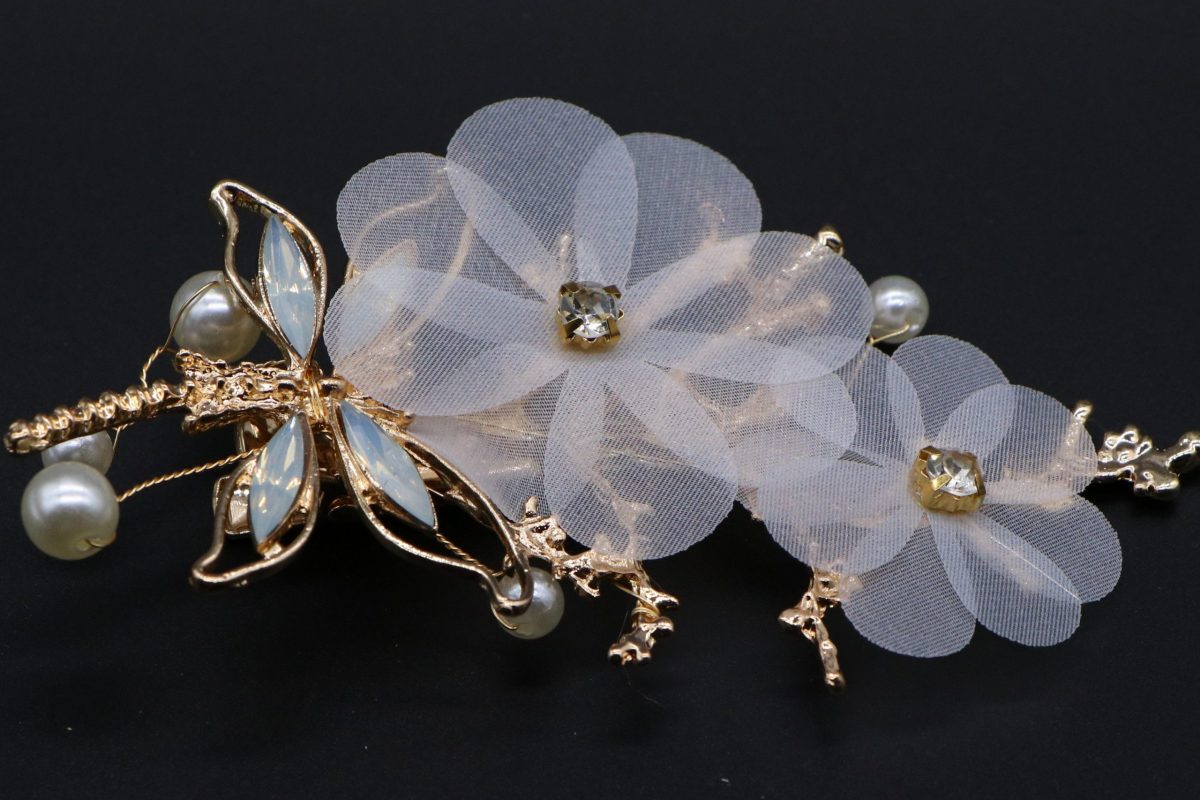 Medium sized hair pin with fabric flowers, pearls and crystals with a delicate feel.