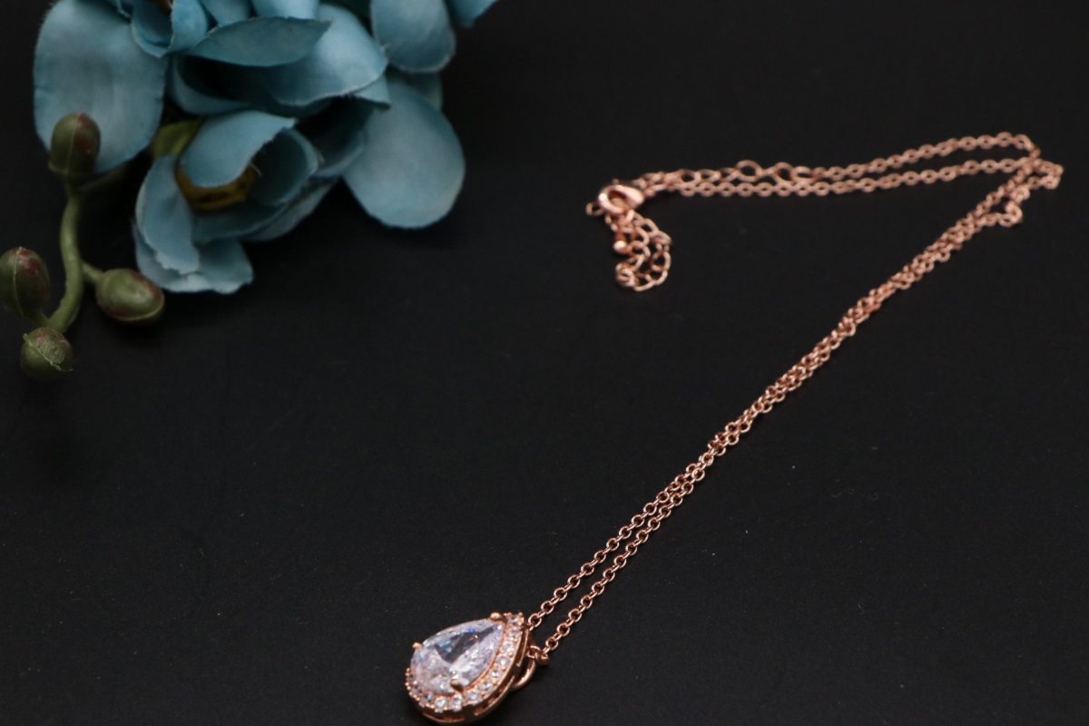 Delicate hypoallergenic metal chain with a crystal tear drop pendant. Suitable for bridal or special occasions.